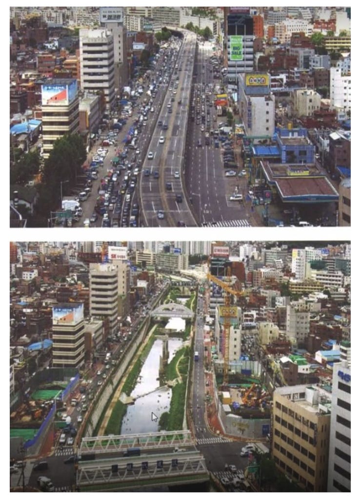 Transformation of Cheonggyecheon 清溪川 复原项目 from an elevated freeway (2002) to an urban greenway (2003). Photos by Na young wan, Seoul Metropolitan Government.