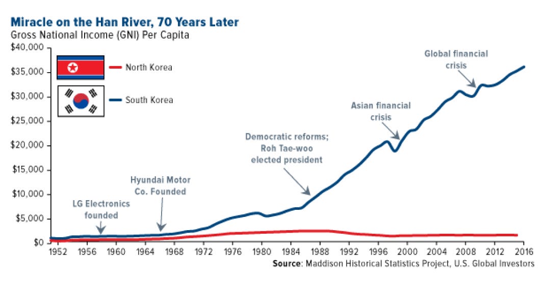 North and South Korea started with similar Gross National Income per Capita following the Korean War (1950-53). There is a difference between authoritarian and totalitarian leadership. The former propelled South Korea into a period of post-war construction known as “Miracle on the Han River.”
