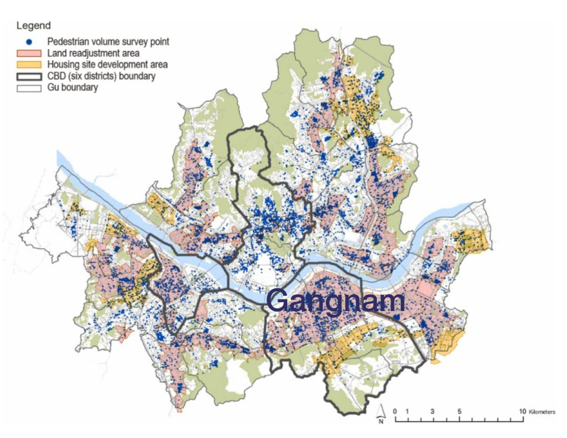 Land readjustment area is highlighted in pink (image source). As Gangnam transformed from farmland to urban land, land value increased ~13,000 times over 26 years (Land Value-Infrastructure Nexus in Land Readjustment: A Case Study of Yeongdong (Gangnam) in Seoul, South Korea).